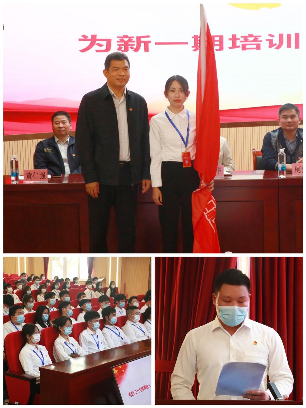 仪式上,张林茂为学校2023年“青马班”学员代表授旗。学校2022年“青马班”优秀学员代表刘嘉斐做交流分享。